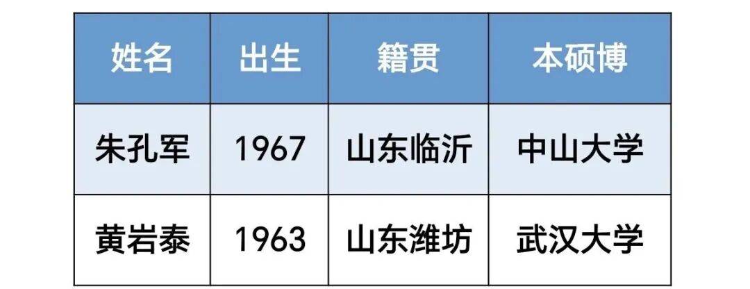 现任和前任武汉大学党委书记均为山东人,朱孔军本硕博均毕业于中山大学,黄岩泰本硕博均毕业于武汉大学,二人虽均为法学博士,但均非法学专业。