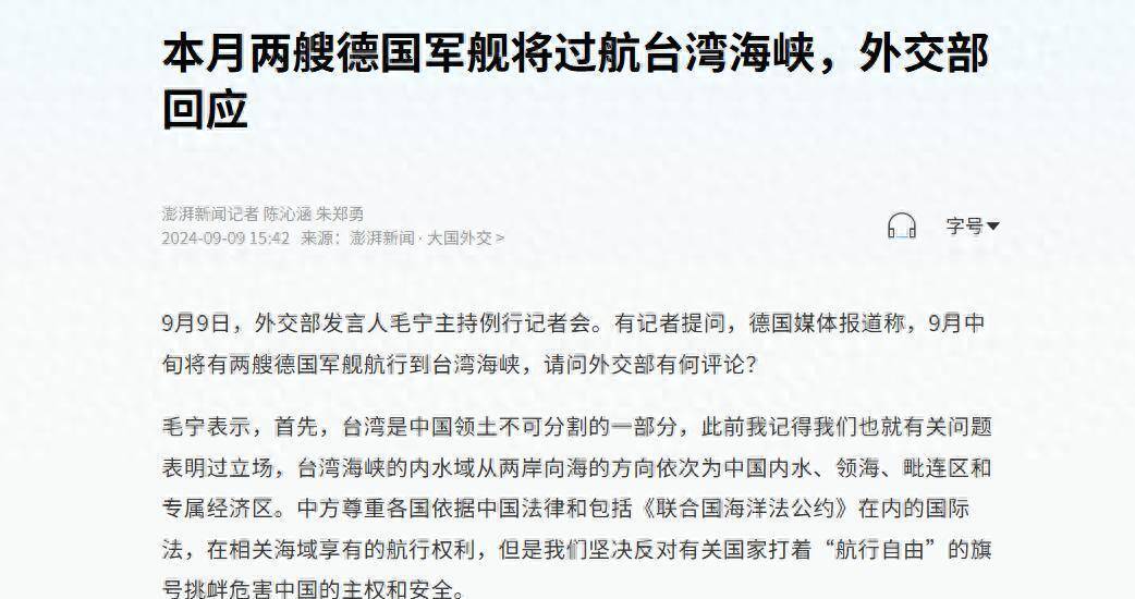 2024年9月13日,德国海军的“巴登·符腾堡”号护卫舰和“法兰克福”号补给舰高调进入台湾海峡。 德国方面事先进行了宣传,声称这是为了维护印太地区的“航行自由”。 然而,根据一位美国记者在北约会议上的爆料,这次穿越行动成了一场灾难。